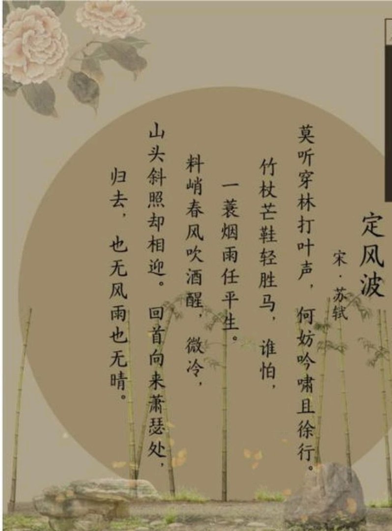 莫听穿林打叶声,何妨吟啸且徐行。竹杖芒鞋轻胜马,谁怕?一蓑烟雨任平生。
